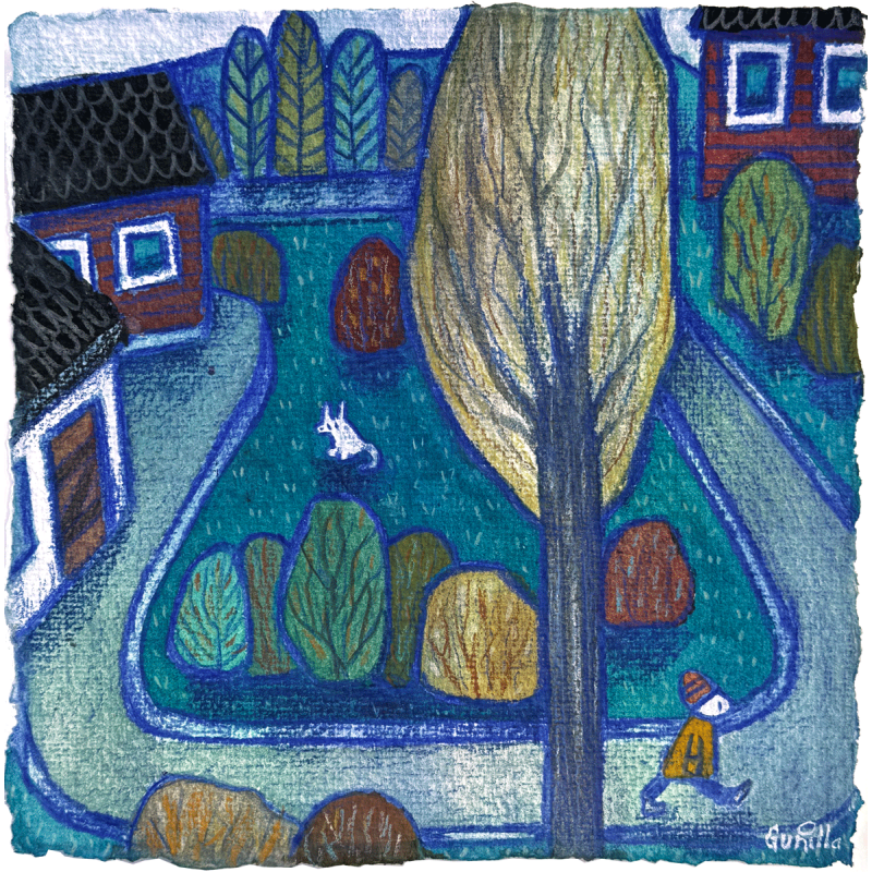 Akvarell og fargeblyant på akvarellpapir. Hele arket måler 18 x 18 cm. Selges hos Galleri Fenka: info@gallerifenka.com