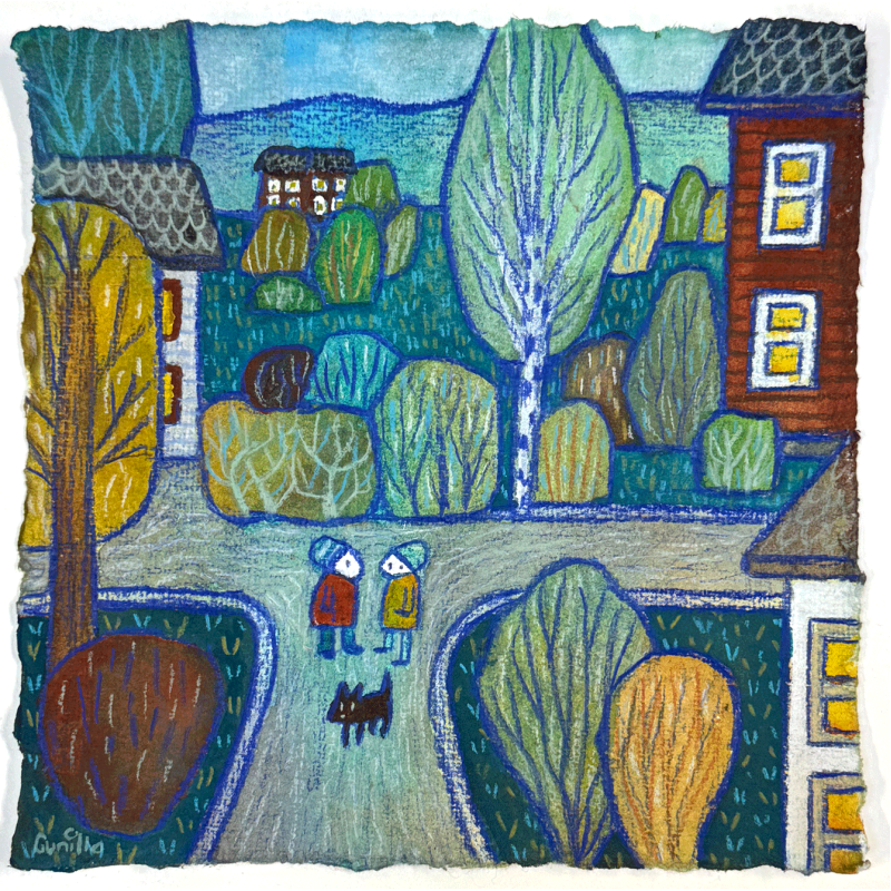 Akvarell og fargeblyant på akvarellpapir. Hele arket måler 18 x 18 cm. Selges hos Galleri Neo i Stavanger.