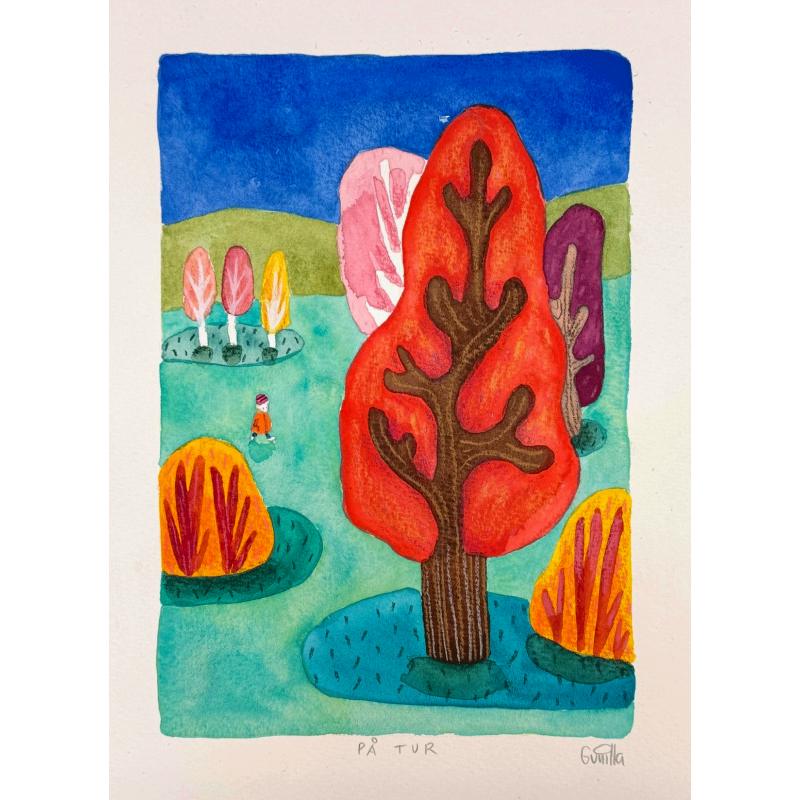 Original akvarell og fargeblyant på akvarellpapir. Motivet er 17,5 x 25,5 cm. Hele arket måler 23 x 31 cm.