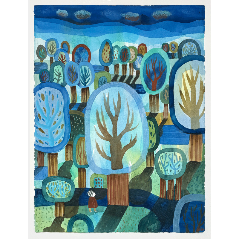 Akrylmaling og fargeblyant på tykt Arches akvarellpapir i bomull. 56 x 76 cm.
