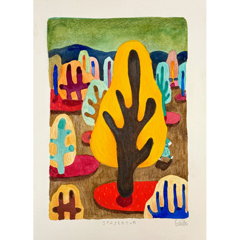 Original akvarell og fargeblyant på akvarellpapir. Motivet er 17,5 x 25,5 cm. Hele arket måler 23 x 31 cm.