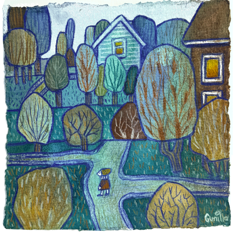 Akvarell og fargeblyant på akvarellpapir. Hele arket måler 18 x 18 cm. Selges hos Galleri Fenka: info@gallerifenka.com