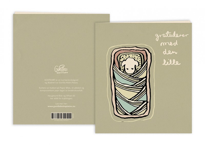 Godtkort er en kortserie designet av Gunilla. Kortene er trykket i Norge på ubleket og komposterbart papir laget av landbruksavfall. Til hvert kort følger det med en blank konvolutt i samme type papir. Str 14 x 16 cm.
